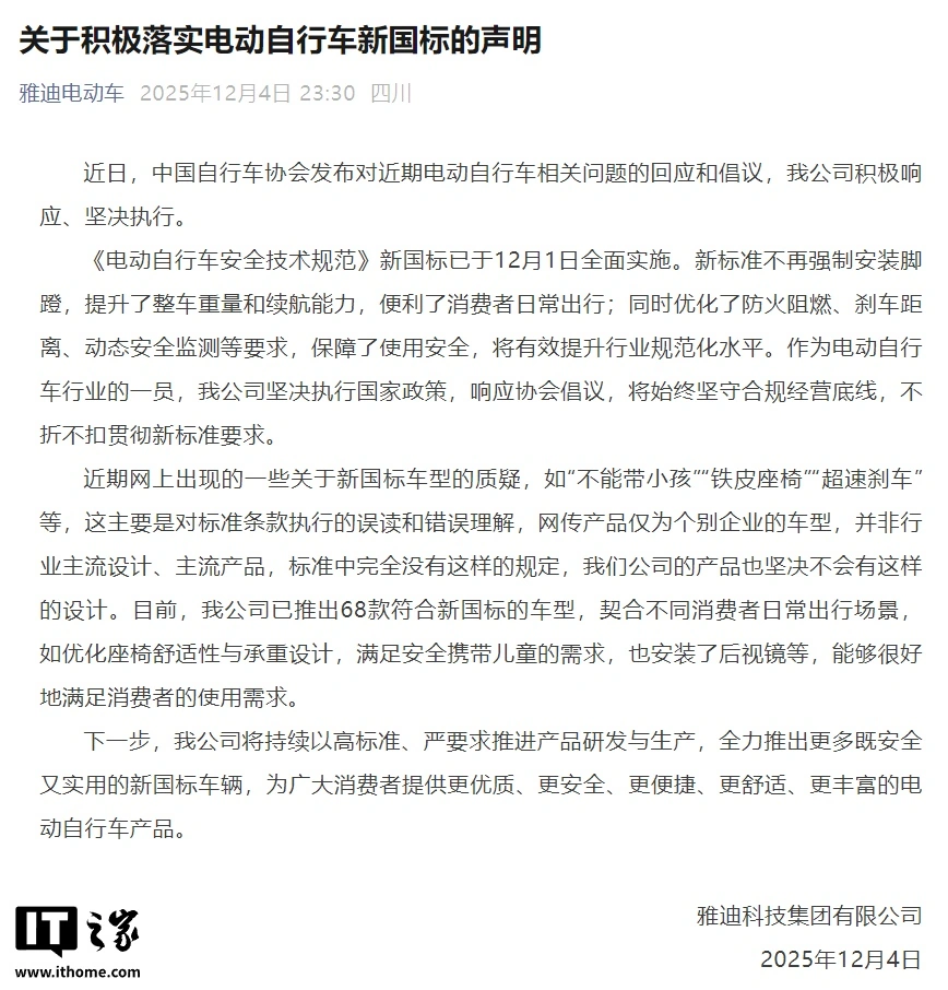 IT之家12月4日消息,雅迪科技集团有限公司今日发布关于积极落实电动自行车新国标的声明: